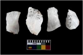 | Description / विवरण | Four utilised worked cores with sharp edges. Flakes removed from almost all the sides. Some are tapering at one end. |