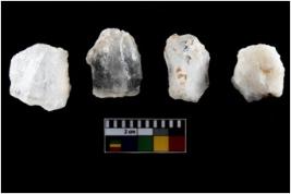 | Description / विवरण | Four utilised worked cores with sharp edges. Flakes removed from almost all the sides. Some are tapering at one end. |
