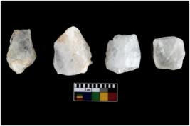 | Description / विवरण | Four utilised worked cores with sharp edges. Flakes removed from almost all the sides. Some are tapering at one end. |