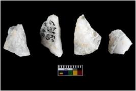 | Description / विवरण | Four utilised worked cores with sharp edges. Flakes removed from almost all the sides. Some are tapering at one end. |