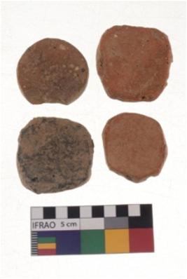 | Description / विवरण | There are n-4 plain pottery discs without perforation. Their colour varies from dark to light red. These discs have eroded edges. |