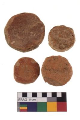 | Description / विवरण | There are n-4 plain pottery discs without perforation. Their colour varies from dark to light red. These discs have eroded edges. |