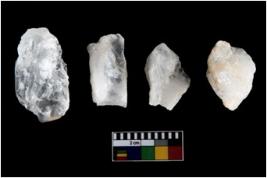 | Description / विवरण | Four utilised worked cores with sharp edges. Flakes removed from almost all the sides. Some are tapering at one end. |