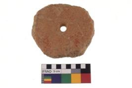 | Description / विवरण | A plain pottery disc with perforation. It is reddish in colour and has eroded edges. |