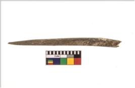 | Description / विवरण | A partially broken specimen of a bone point with manufacture marks. It is smooth and well polished. |
