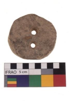 | Description / विवरण | A plain pottery disc with double perforation. It is reddish in colour and has eroded edges. |