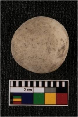 | Description / विवरण | A complete specimen of an oblong shaped sling ball with flat base. It is made of quartz and its surface is smooth. |
