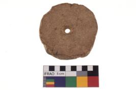 | Description / विवरण | A plain pottery disc with perforation. It is reddish in colour and has eroded edges. |