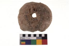 | Description / विवरण | A plain pottery disc with perforation. It is reddish in colour and has eroded edges. |