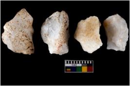 | Description / विवरण | There are n-4 of intact flake cores made up of Quartz. Some of them have bulge of percussion and some are flat flakes. |