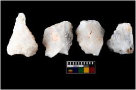 | Description / विवरण | There are n-4 of intact flake cores made up of Quartz. Some of them have bulge of percussion and some are flat flakes. |