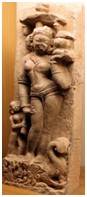 | Description / विवरण | This image is canopied with a chhatra or unbrella. She is standing in tribhanga pose on her vehicle makar. Here a lady attendant depicted in right side of the image .She wears ear-rings, anklet, armlet, necklace, yajnopavita and bangles. Her uplifted left hand holds a jar or purnakumbha or pitcher full of water. Her right hand is placed on her thigh. |