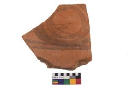 | Description / विवरण | A specimen of a potsherd. It is reddish in colour with black decorative geometric painting on it. |