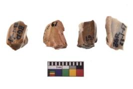 | Description / विवरण | Four utilised worked cores with sharp edges. Flakes removed from almost all the sides. Some are tapering at one end. |