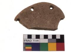 | Description / विवरण | A plain pottery disc with 3 perforation ath the border. It is reddish in colour and has eroded edges. |