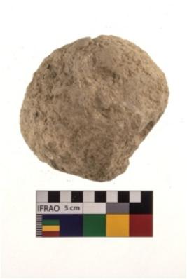 | Description / विवरण | A partially broken specimen of a hammer stone with rough surface, it is made of quartz , it is roughl;y circular in shape. |
