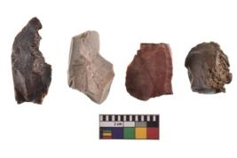 | Description / विवरण | Four utilised worked cores with sharp edges. Flakes removed from almost all the sides. Some are tapering at one end. |
