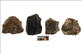 | Description / विवरण | Specimen of four worked utilised cores showing impressions of blades removed from almost all the sides. |
