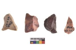 | Description / विवरण | Four utilised worked cores with sharp edges. Flakes removed from almost all the sides. Some are tapering at one end. |