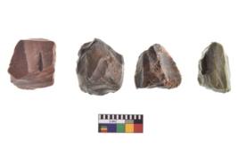 | Description / विवरण | Four utilised worked cores with sharp edges. Flakes removed from almost all the sides. Some are tapering at one end. |