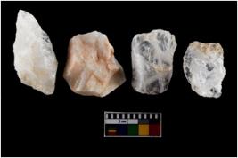 | Description / विवरण | There are n-4 of intact flake cores made up of Quartz. Some of them have bulge of percussion and some are flat flakes. |