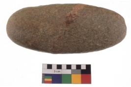 | Description / विवरण | A complete specimen of an oval shaped muller. It has battered surface along with curved ridges and oval section. |