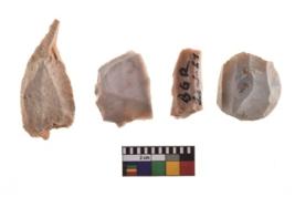 | Description / विवरण | Four utilised worked cores with sharp edges. Flakes removed from almost all the sides. Some are tapering at one end. |