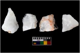 | Description / विवरण | There are n-4 of intact flake cores made up of Quartz. Some of them have bulge of percussion and some are flat flakes. |