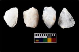 | Description / विवरण | There are n-4 of intact flake cores made up of Quartz. Some of them have bulge of percussion and some are flat flakes. |