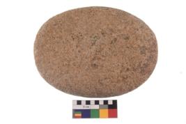 | Description / विवरण | A complete specimen of an oval shaped muller. It has battered surface along with curved ridges and oval section. |