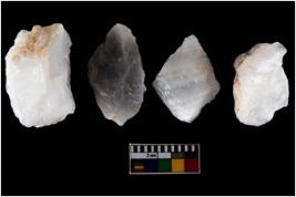 | Description / विवरण | There are n-4 of intact flake cores made up of Quartz. Some of them have bulge of percussion and some are flat flakes. |
