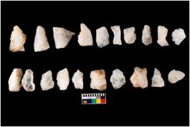 | Description / विवरण | Specimen of flake tool with prominent flaking marks. It made up of a short flakes with sides trimmed. |