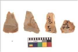 | Description / विवरण | Four worked flakes with sharp edges, some of them are tapering at one end. |