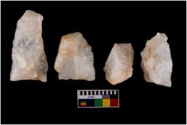 | Description / विवरण | Four worked flakes with sharp edges, some of them are tapering at one end. |