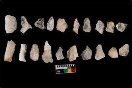 | Description / विवरण | Specimen of flake tool with prominent flaking marks. It made up of a short flakes with sides trimmed. |