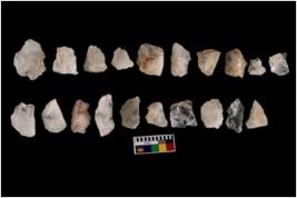 | Description / विवरण | Specimen of flake tool with prominent flaking marks. It made up of a short flakes with sides trimmed. |