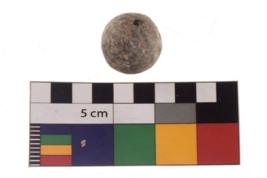 | Description / विवरण | A complete specimen of a sling ball having rough surface and reddish black colour. |