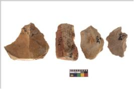 | Description / विवरण | Four worked flakes with sharp edges, some of them are tapering at one end. |