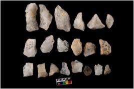 | Description / विवरण | Specimen of flake tool with prominent flaking marks. It made up of a short flakes with sides trimmed. |