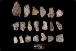 | Description / विवरण | Specimen of flake tool with prominent flaking marks. It made up of a short flakes with sides trimmed. |