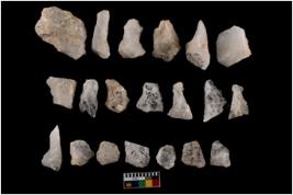 | Description / विवरण | Specimen of flake tool with prominent flaking marks. It made up of a short flakes with sides trimmed. |