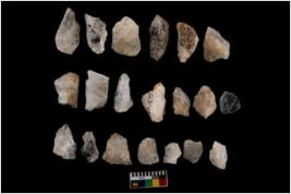 | Description / विवरण | Specimen of flake tool with prominent flaking marks. It made up of a short flakes with sides trimmed. |