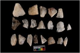| Description / विवरण | Specimen of flake tool with prominent flaking marks. It made up of a short flakes with sides trimmed. |