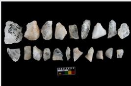 | Description / विवरण | There are n-20 of intact flake cores made up of Quartz. Some of them have bulge of percussion and some are flat flakes. |