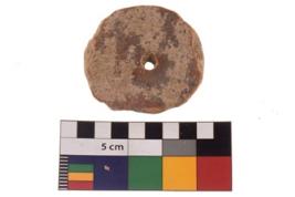 | Description / विवरण | A plain pottery disc with perforation. It is reddish in colour and has eroded edges. |