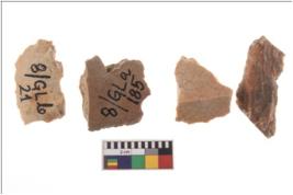 | Description / विवरण | Four worked flakes, some are irregular whereas some are tapering at one end. Most of them are having sharp edges. |