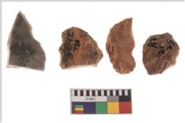 | Description / विवरण | Four worked flakes, some are irregular whereas some are tapering at one end. Most of them are having sharp edges. |