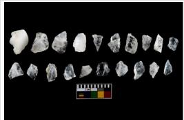 | Description / विवरण | There are n-20 of intact flake cores made up of Quartz. Some of them have bulge of percussion and some are flat flakes. |