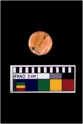 | Description / विवरण | It is complete Oblate shape bead with a white net pattern on the orange surface with one perforation at the periphery. |