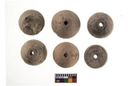 | Description / विवरण | Six Areca nut shaped beads with perforations. |